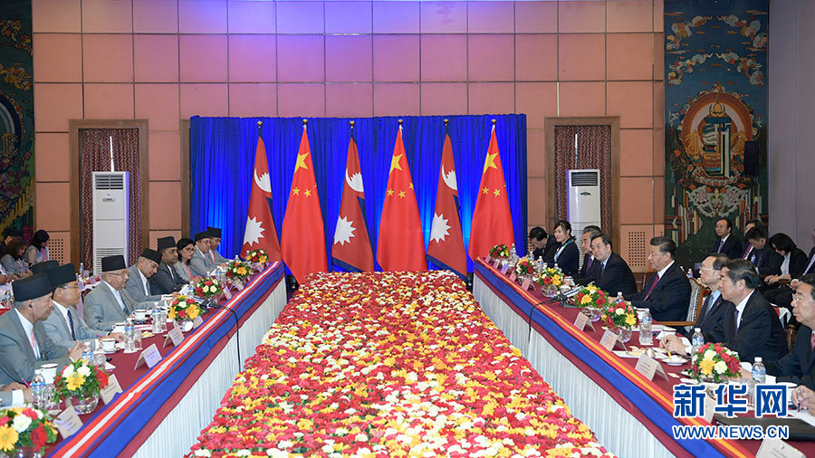 10月13日,国家主席习近平在加德满都同尼泊尔总理奥利会谈。 新华社记者 李学仁 摄