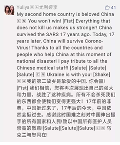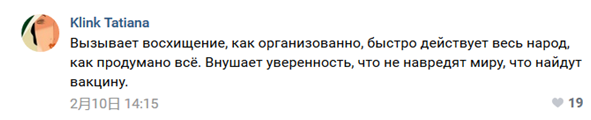 俄罗斯网友留言称,中国的抗疫工作非常有组织,人民行动迅速,执行到位。相信,一定能研制出病毒疫苗。