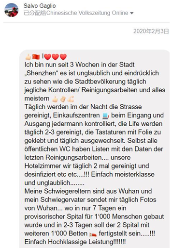 德国网友Salvo Gaglio留言称,我到深圳才三周,我见证了深圳市民每天是如何遵守各项政府管控措施,如何努力克服一切困难的,这一切令人印象深刻。每天夜晚有人清扫街道,购物中心的入口有人管理,电梯每天会清洁2-3次,按键表面都被覆盖了一层塑料薄膜,每天有人更换。即使是公共卫生间都贴有一张清单,上面标注了清扫的日期时间。我们酒店的房间一天会打扫两次并彻底地杀菌消毒。非常专业,令人不敢相信!