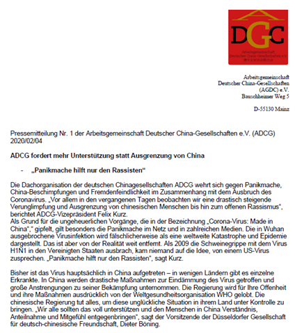 德国德中友协联合会在一份公开声明中对中国政府的应对举措给予了高度肯定。声明称,中国采取了非常严厉的措施来阻止病毒传播,并付出了极大努力。世界卫生组织对中国政府的开放态度和应对措施给予了高度评价。中国政府正尽其所能控制疫情。