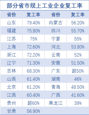 虽然返程人数与去年同期相比仍处低位,但各地复工进程已经推进,企业生产经营正有序恢复。梳理公开信息,全国已有超过10个省(自治区、直辖市)的规模以上工业企业复工率超过60%,东部省市占据主流。山东、福建和江苏省的规上企业复工率超过75%,长三角地区上海、浙江和江苏的规上企业复工率均超过70%。