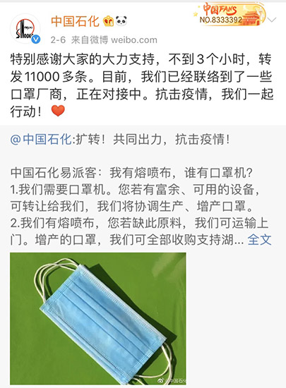 2月6日,中国石化官微“喊话”后不到3个小时就找到了合作伙伴,24小时后对接完成11条口罩生产线。(中国石化官方微博截图)