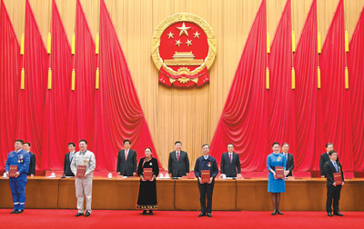 在欢快的乐曲声中,全国劳动模范和先进工作者代表依次登上主席台,习近平等为他们颁发荣誉证书。