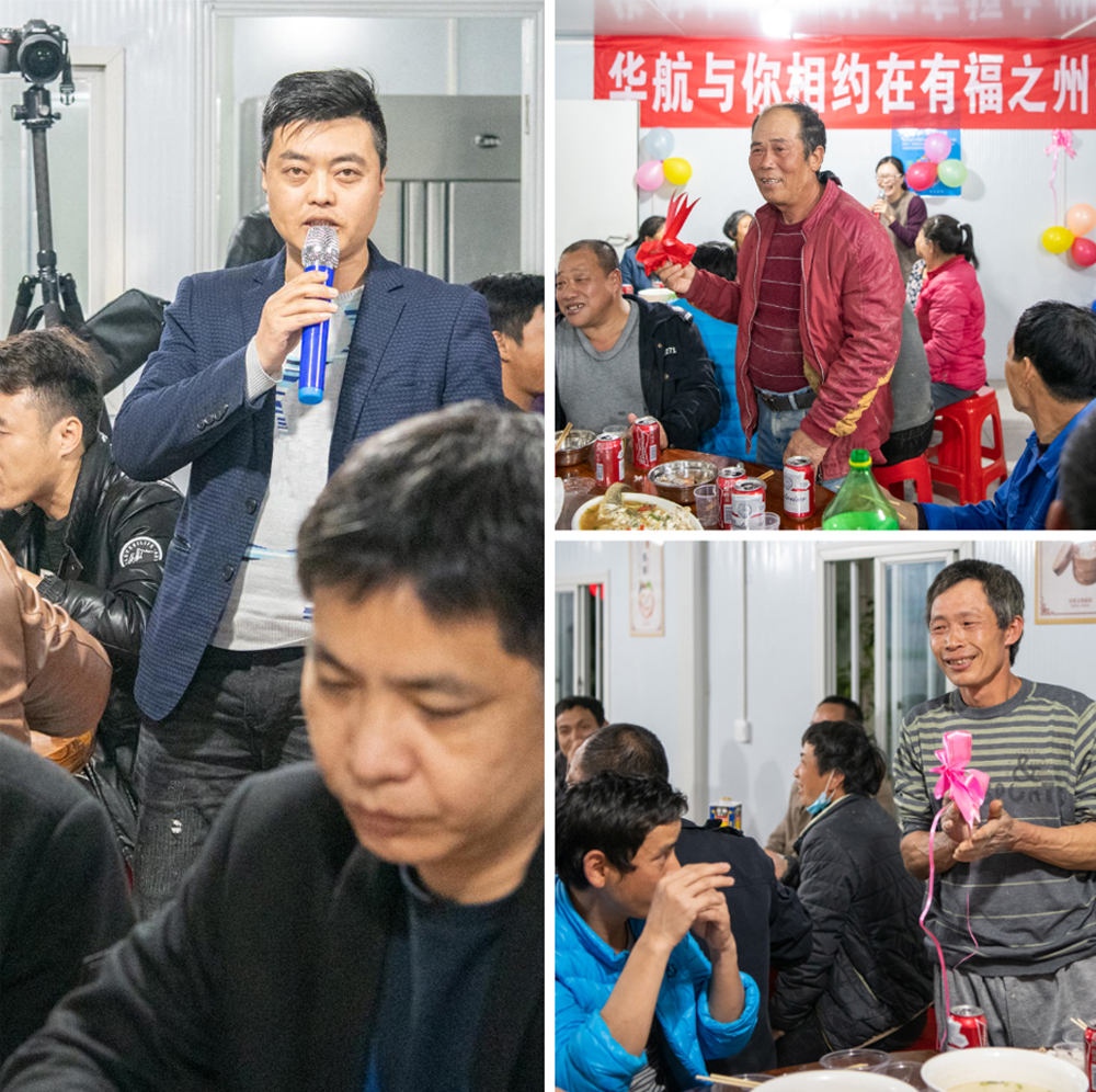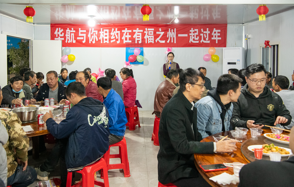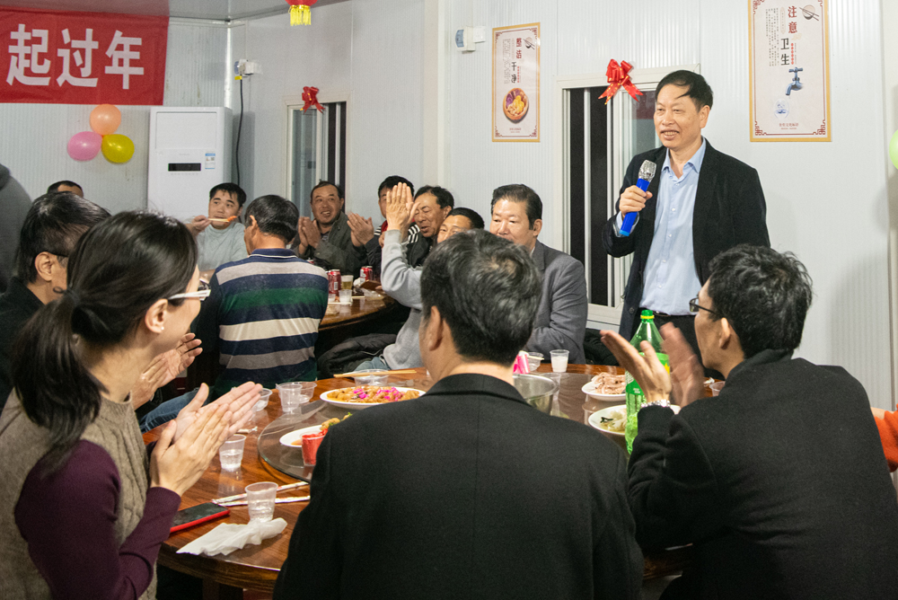 华灯初上,夜幕降临,好博(中国)集团董事长、党支部书记张华官,陈益魁总经理等领导和党员同志们来到项目部年夜饭现场,与一线建设者们共同欢度节日。在彩花、汽球妆点下的年夜饭现场,不时传出阵阵欢声笑语。张华官书记邀请大家共同举杯,他说,你们积极响应国家号召,主动放弃与家人团聚的机会,为疫情防控和增产增效贡献自己的力量,这样的付出让人感动也值得珍视,企业会扎实做好各方面保障,让你们在福州度过一个美好的春节。