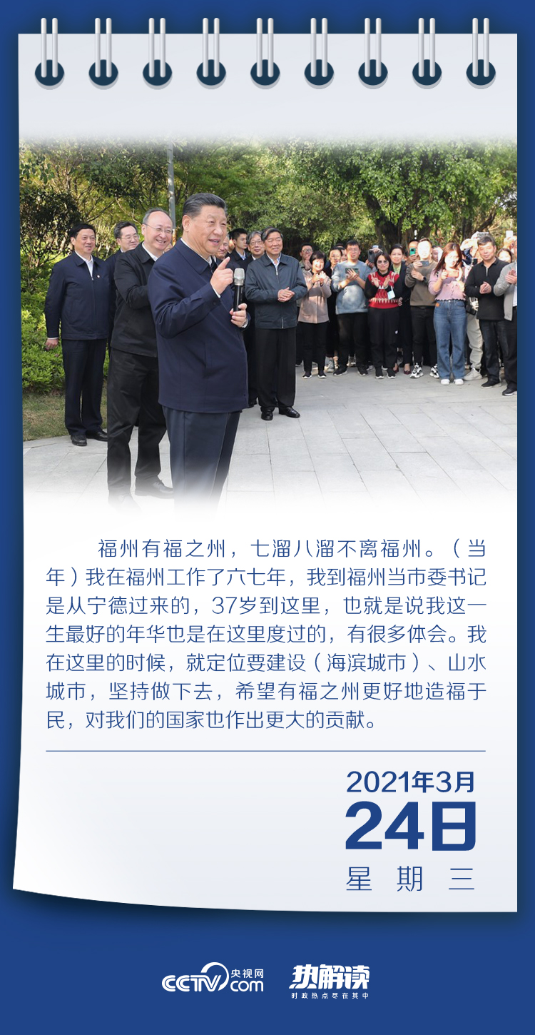 总书记深情地说:“福州有福之州,七溜八溜不离福州。(当年)我在福州工作了六七年,我到福州当市委书记是从宁德过来的,37岁到这里,也就是说我这一生最好的年华也是在这里度过的,有很多体会。我在这里的时候,就定位要建设(海滨城市)、山水城市,坚持做下去。”