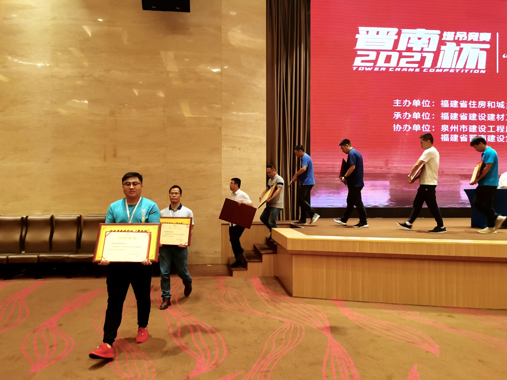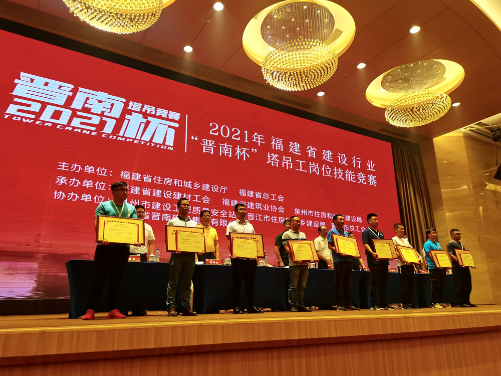 6月8日-10日,由福建省住房与城乡建设厅、福建省总工会主办,福建晋南建设集团有限公司协办的2021年福建省建设行业“晋南杯”塔吊工岗位技能竞赛在泉州火热举办。经过紧张激烈的比赛,福建好博(中国)建设集团获得团体奖项第三名,并接受颁奖。