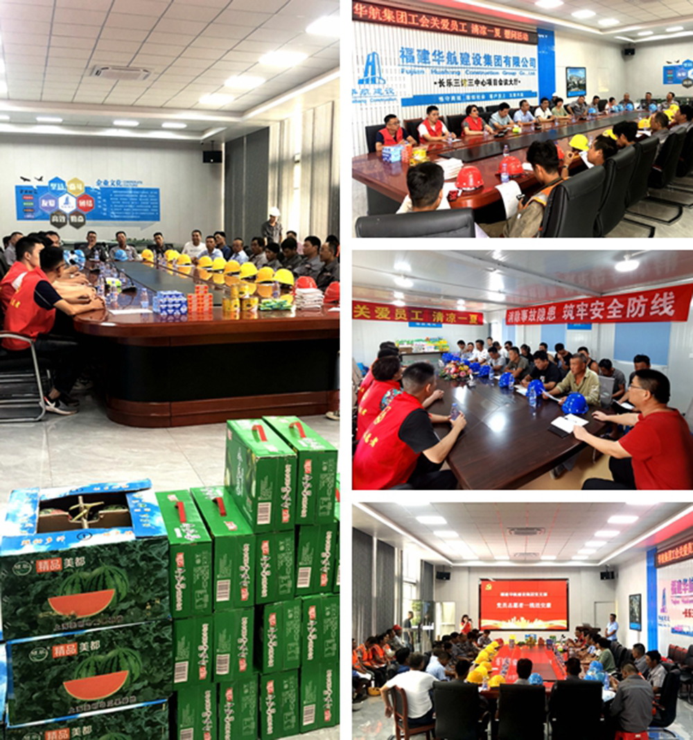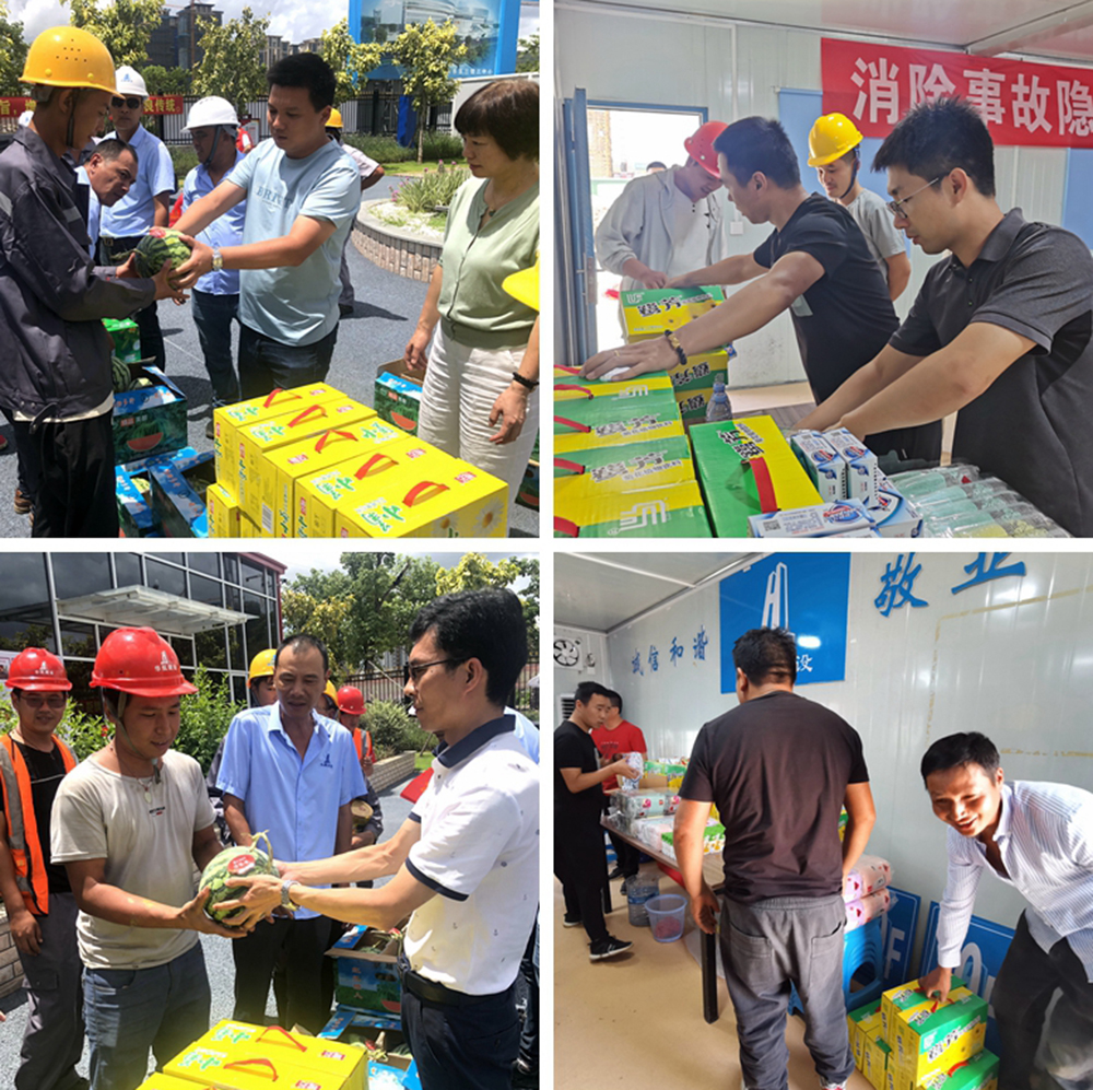 近日,集团党支部、工会联合项目管理中心等职能部门,来到长乐区三馆三中心、福港商务中心等项目部,通过多种互动形式,广泛宣传“安全生产月”“安康杯”竞赛活动主题及内容,并为坚持辛勤奋战在工地的一线建设者送去饮料、西瓜、凉茶冲剂、消暑用品等慰问品,让他们在炎热的夏日中感受到了关心和清凉。工人兄弟们表示要将集团的这份爱护,转化为加强作业保护和提高工作效率的动力,为项目的生产安全、实施进度、建造品质,以及祖国各处的地方城市建设,贡献一份力量。