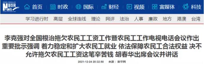 新华社北京12月24日电 全国根治拖欠农民工工资工作暨农民工工作电视电话会议12月24日在京召开。中共中央政治局常委、国务院总理李克强作出重要批示。