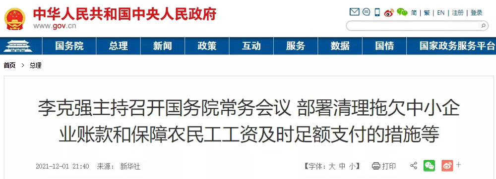 12月1日,国务院总理李克强主持召开国务院常务会议 部署清理拖欠中小企业账款和保障农民工工资及时足额支付的措施等。