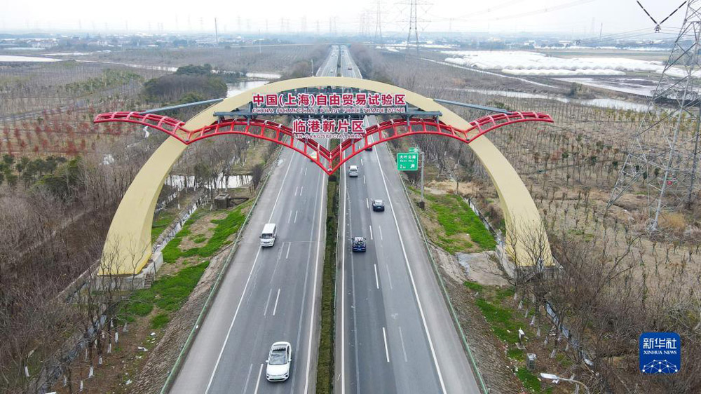 S2沪芦高速上的中国(上海)自由贸易试验区临港新片区“海鸥门”(210日摄,无人机照片)。新华社记者 方喆 摄