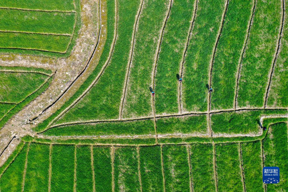 39日,浙江省宁波市鄞州区东吴镇天童村村民在田间管护农作物(无人机照片)。新华社发(胡学军 摄)