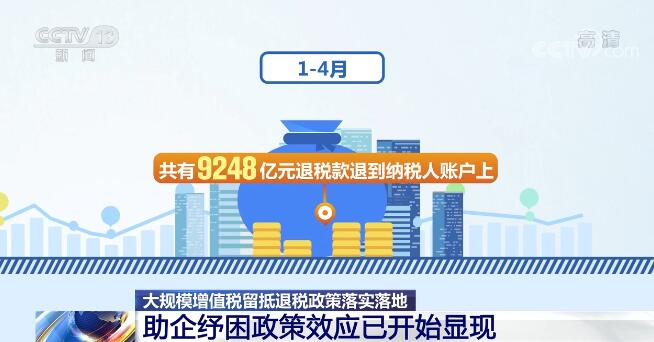 据统计,今年4月1日至30日,全国已有8015亿元增值税留抵退税款退到145.2万户纳税人账户上,再加上一季度继续实施的此前出台的留抵退税政策退税1233亿元,1—4月共有9248亿元退税款退到纳税人账户上,助企纾困的政策效应已经开始显现。