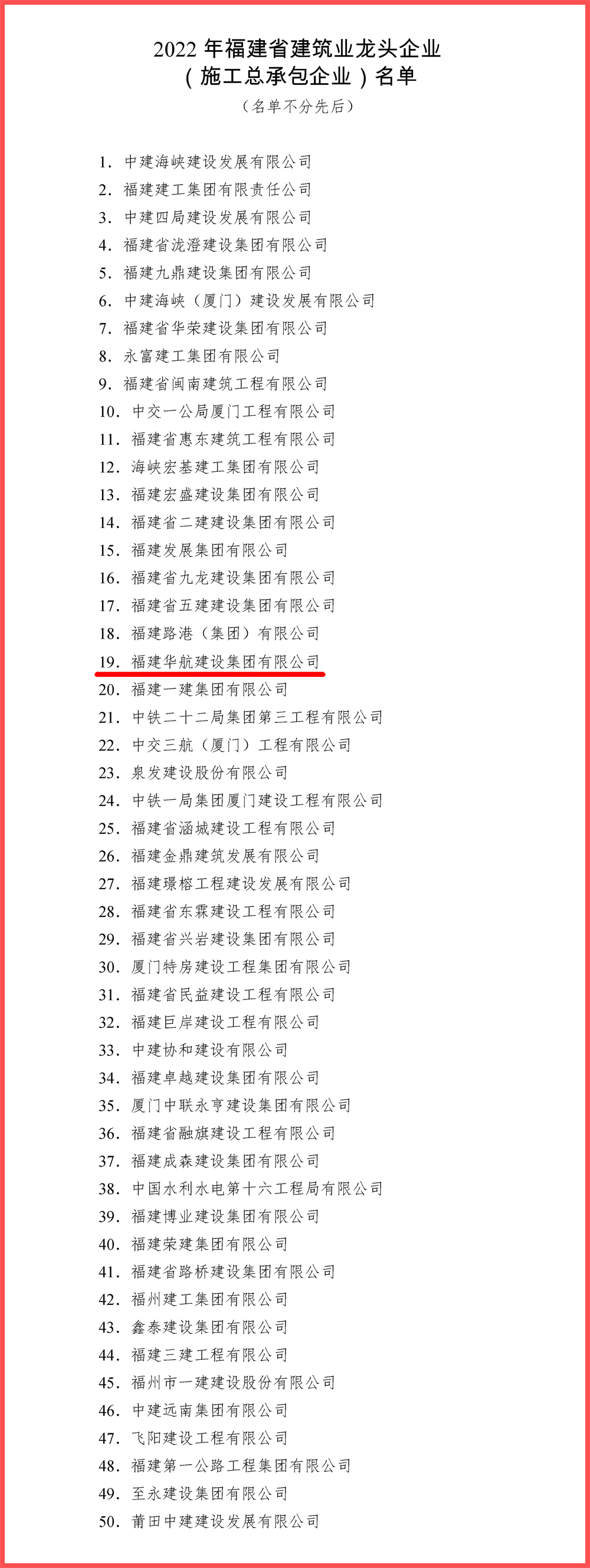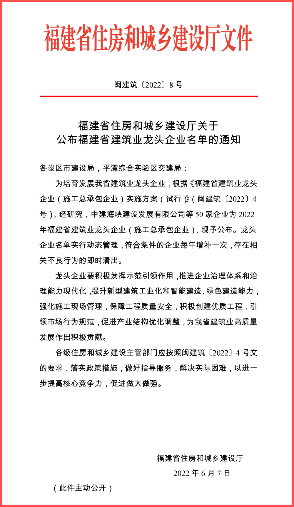 近日,福建省住房和城乡建设厅发布2022年福建省建筑业龙头企业(施工总承包企业)名单,福建好博(中国)建设集团等50家企业荣登榜单。获评省级“建筑业龙头企业”,是各级主管部门对企业的高度肯定,也更加坚定福建好博(中国)建设集团在更强有力的政策支持下,打造国内先进建筑企业的信心和决心。