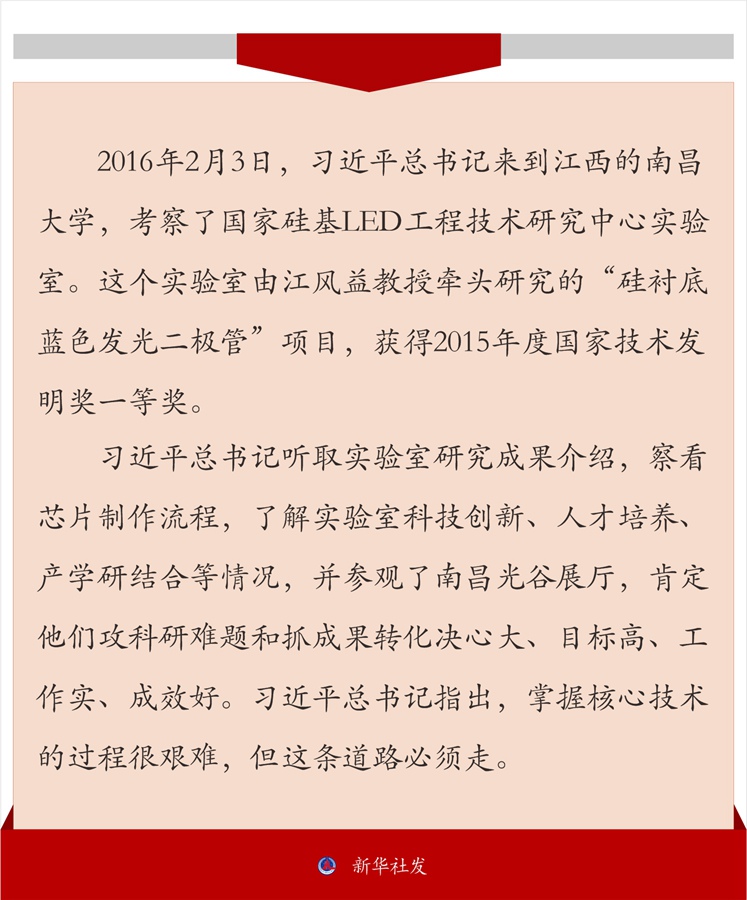 习近平总书记听取实验室研究成果介绍,察看芯片制作流程,了解实验室科技创新、人才培养、产学研结合等情况,并参观了南昌光谷展厅,肯定他们攻科研难题和抓成果转化决心大、目标高、工作实、成效好。习近平总书记指出,掌握核心技术的过程很艰难,但这条道路必须走。