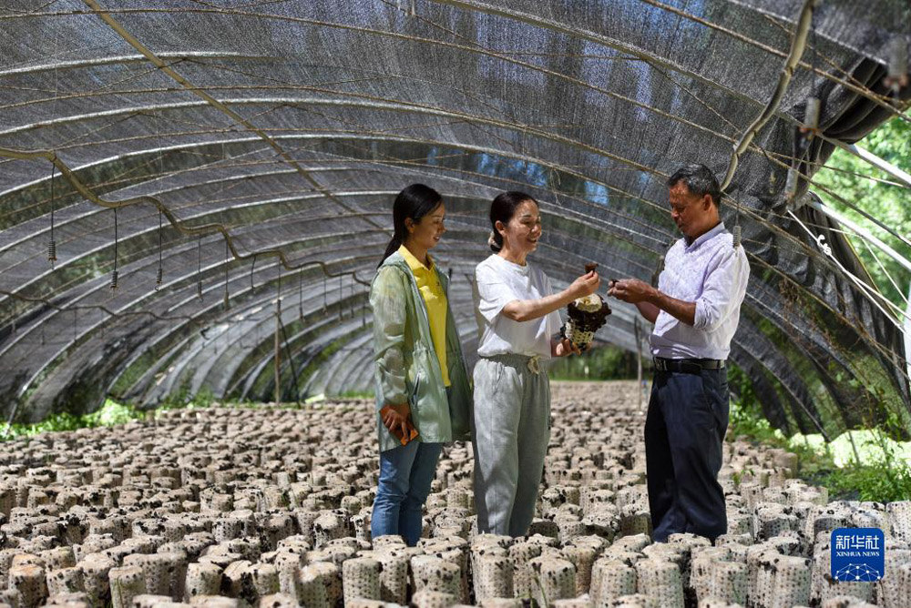 新疆维吾尔自治区党委组织部、老干部局驻托万克麦盖提村“访惠聚”工作队第一书记陈双萍(中)和工作队员来到生态园与技术员陈金生(右)查看培育的木耳(2022年6月7日摄)。新华社记者 丁磊 摄