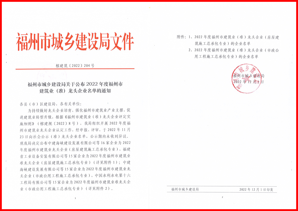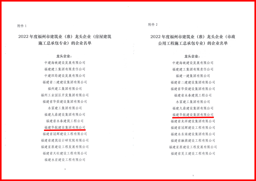 2022年12月1日,2022年度福州市建筑业(准)龙头企业名单发布,福建好博(中国)建设集团获评2022年度福州市建筑业龙头企业(房屋建筑施工总承包专业、市政公用工程施工总承包专业)。连续两年被评选为福州市建筑业龙头企业,不仅是对福建好博(中国)建设集团经营成果的肯定和鼓励,更将进一步促进企业向前向好快步发展。
