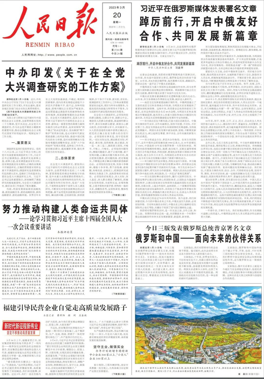 3月20日,人民日报头版刊发报道,点赞福建传承弘扬“晋江经验”,实施新时代民营经济强省战略,鼓励和支持民营经济和民营企业发展壮大。