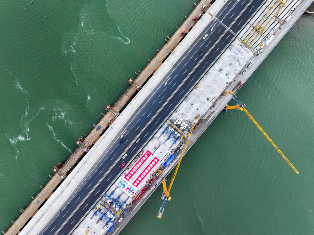 这是1月21日拍摄的深汕西高速长沙湾跨海特大桥(无人机照片)。当日,中铁四局承建的深汕西高速改扩建项目长沙湾跨海特大桥左幅主跨合龙。新华社记者刘大伟摄